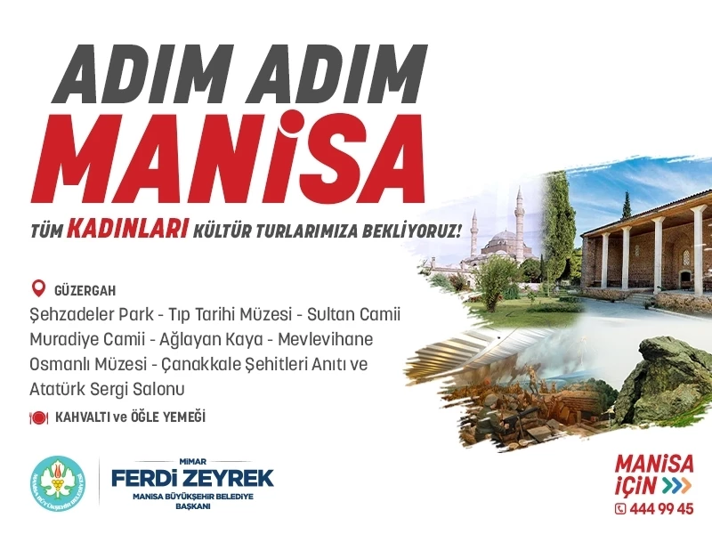 Manisa Büyükşehir Belediye Başkanı Mimar Ferdi Zeyrek, tüm kadınları ‘Adım Adım Manisa’ gezisine davet etti. Başkan Zeyrek, “Projeyi, Manisalı kadınların sosyal hayata katılımını artırmak ve Manisa’nın güzelliklerini daha yakından tanımalarını sağlamak amacıyla başlatıyoruz” dedi.