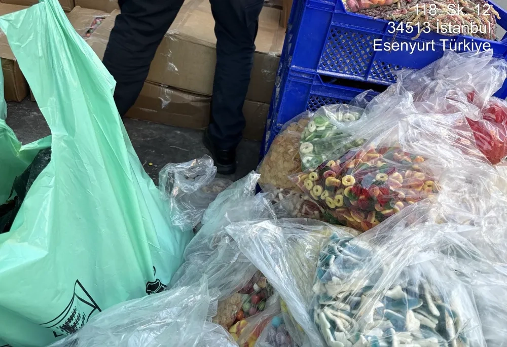 Esenyurt’ta halk sağlığını tehdit eden kaçak bir şekerleme atölyesine yönelik yapılan denetimde, sağlıksız koşullarda üretilip paketlendiği belirlenen 9 ton 400 kilo jelibon ve çeşitli şekerleme ürünü imha edildi. Ruhsatsız faaliyet gösterdiği tespit edilen işletme mühürlenerek kapatıldı.